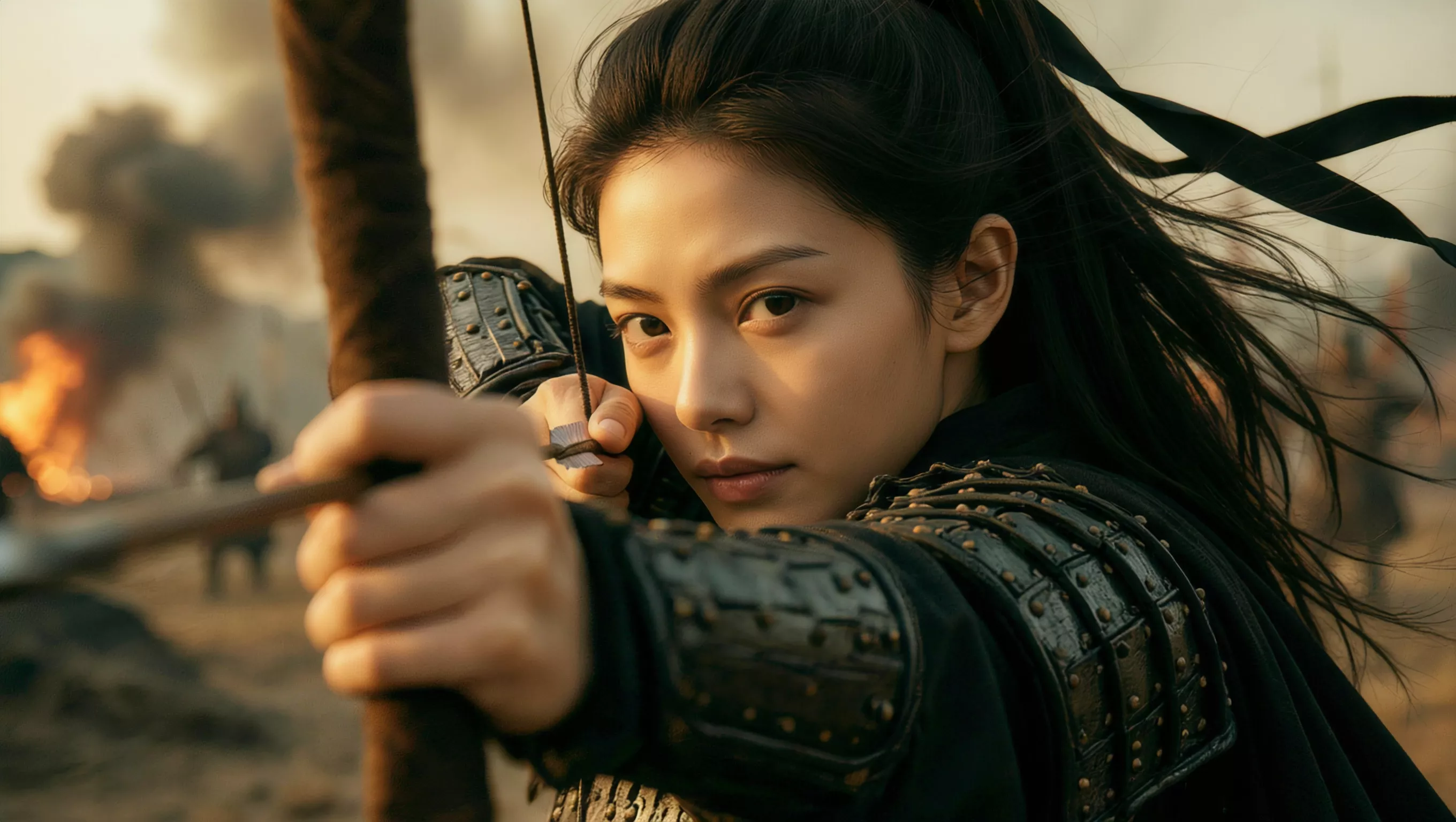 ![]() | Cinematic ancient action movie still, 16:9, style of Shadow. Low-angle close-up side shot of the female protagonist in ancient armor on a dusk battlefield, pulling a bow and aiming forward. Fingers strained white, sharp determined gaze, coat and hair blowing in the wind. Foreground bow blurred, focus on the facial expression. Diagonal dynamic composition. Realistic skin and fabric textures. Natural dusk light outlining silhouette, dusty blurred background, yellow-green tone, dramatic movie lighting with facial shadows. | ![]() |