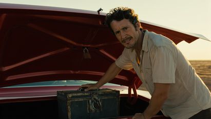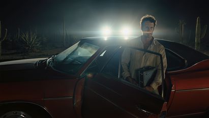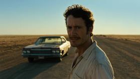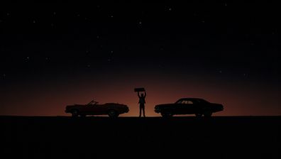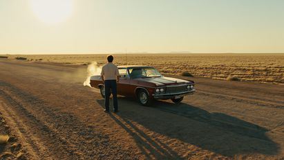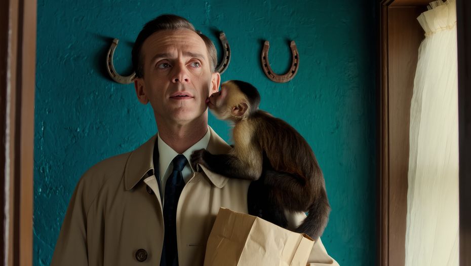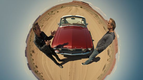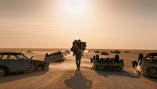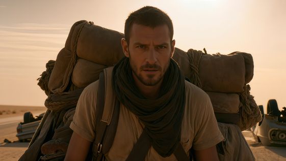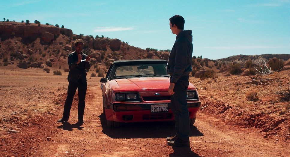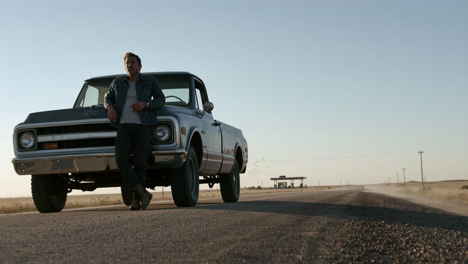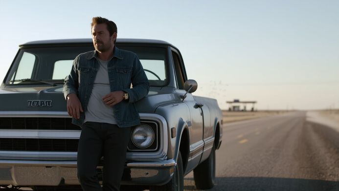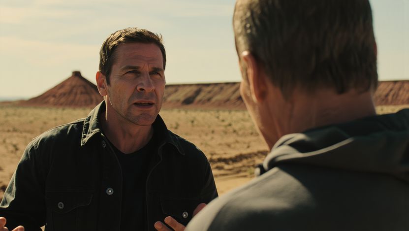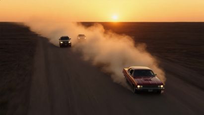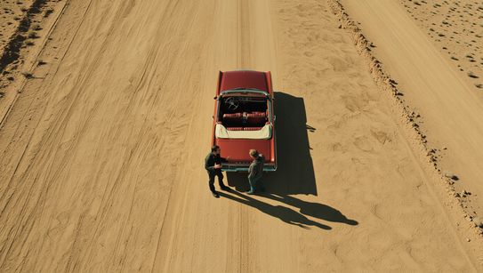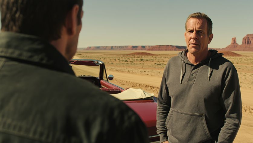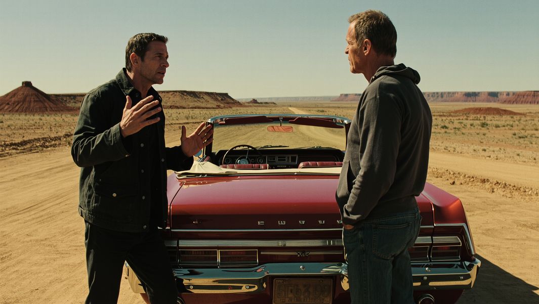 prompt: The image features two men and a red convertible, styled in a western crime film manner. The man on the left wears a black jacket and pants, with a relaxed posture; the man on the right is in a dark gray hoodie and jeans, with a tense stance. The red Ford convertible has a vintage look, fitting the desert standoff vibe. The two men face each other on opposite sides of the car, with the left man raising his hands in a deceptive gesture, and the right man with hands in his pockets, slightly turned in vigilance. The setting is a desert with red-brown rock hills, sparse vegetation, and a pale blue sky. The lighting is strong midday sunlight, creating sharp contrasts and shadows on the men, car, and ground, emphasizing texture and a sense of tension. The composition centers the car, with the men on either side, framed by desert hills in the background. The color scheme contrasts vibrant red with subdued desert tones, enhancing the crime film's tense mood. The shot is at eye level, with a medium depth of field, clearly capturing details of the men and car, while the distant hills blur naturally. The film quality has a cinematic grain, with sharp contrasts and subtle details, evoking a sense of tension, testing, and isolation. | |