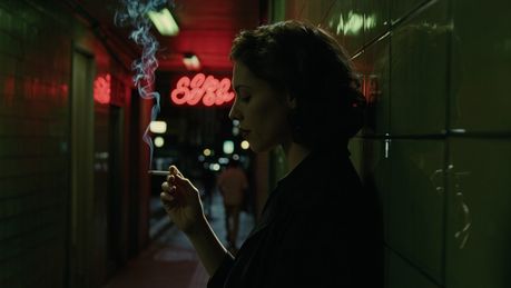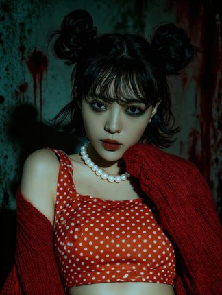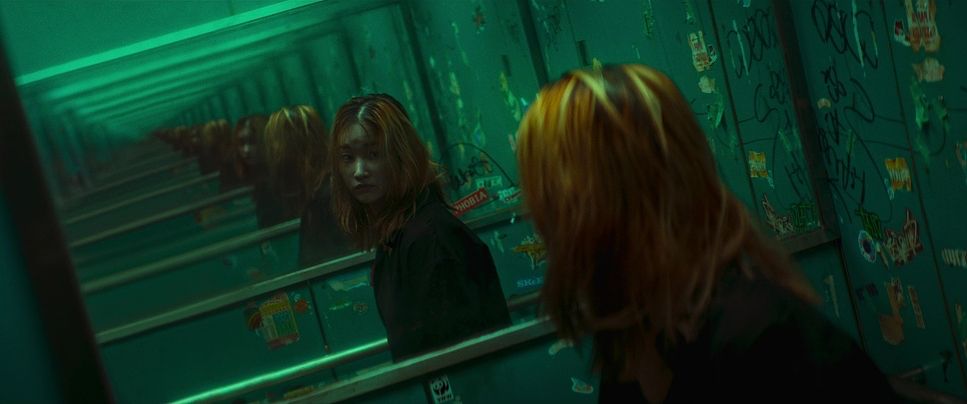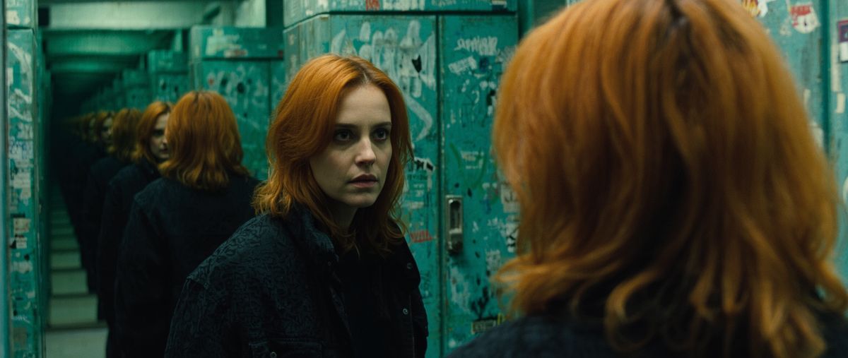 prompt: The image features a young woman with a dark, edgy style: orange-yellow medium-length hair, dressed in a dark casual jacket, fitting the isolated atmosphere of a confined space. She faces away from the camera, head tilted left, her gaze through the mirror directed at the lens, with a calm yet cold expression. The setting is a mirrored indoor space (possibly a locker room), with teal-green lockers covered in stickers and graffiti. The mirrored wall extends the space into an infinite hallway, creating a tense, mysterious atmosphere. Cold artificial top lighting casts shadows, enhancing the closed-in feel and the depth of reflections. The composition focuses on multiple mirror reflections: the person is on the right (1/3 of the image), while the reflections extend leftward into the distance (2/3), with lockers filling the background. The colors are cool teal (space), dark (clothing), and orange-yellow (hair), contrasting to match the dark, mysterious tone. The shot is a side, eye-level view, capturing the depth of reflections and the character's posture. The shallow depth of field keeps the woman and the first reflection in focus, while the distant reflections blur naturally, amplifying the suspenseful, oppressive mood. The film grain highlights the locker textures, reflections, and hair details. | |