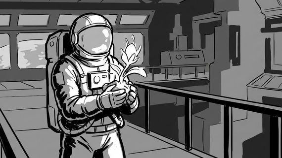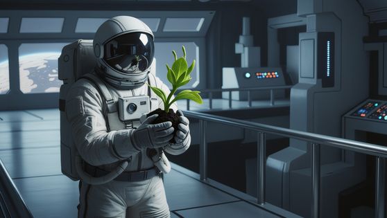 Sci-fi movie. Astronaut cradling soil-rooted flower in sleek space station. Cold tones, ultra-detailed. |