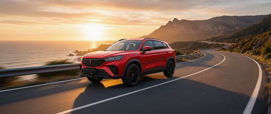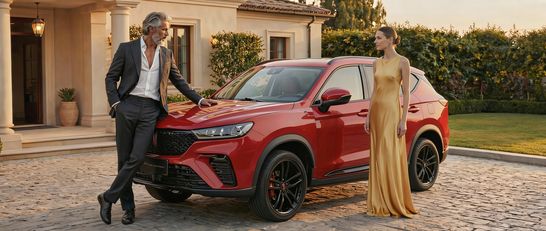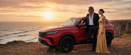 Prompt: Auto TVC: Consistent car/cast. S1: Driving. S2: Man driving POV. S3: Woman at villa checking watch. S4: Couple face-off by car. S5: Couple cruising. S6: Cliffside ocean view. TVC storyboard. Reference: | ||||||