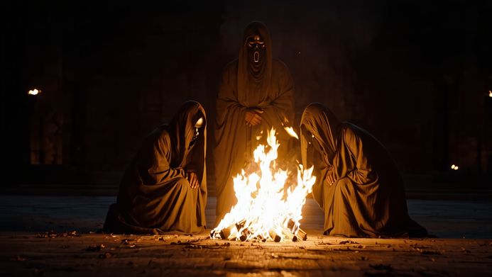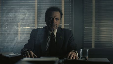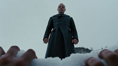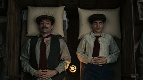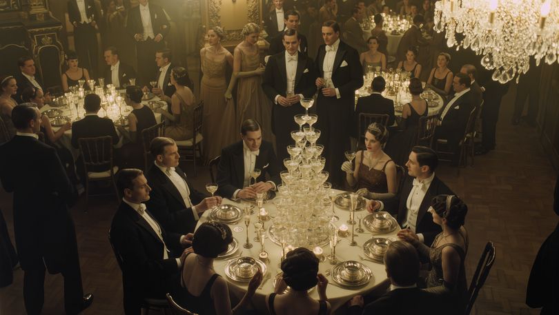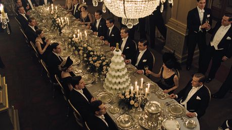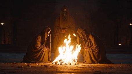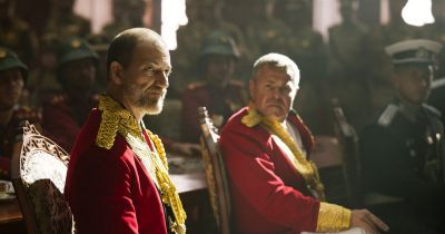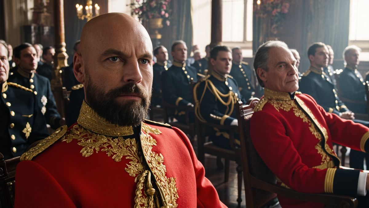 prompt: The image features two men in ornate red uniforms with gold embroidery. The man on the left is bald with a beard, exuding authority, while the man on the right has gray hair and a calm demeanor. The left figure sits upright, gazing sternly off-camera, while the right leans back with a slightly tilted head, his expression contemplative. The setting is a formal indoor venue with rows of military or formally dressed figures and classical wooden furniture. The lighting is soft, backlit, creating highlights on their contours and clothing, with a dark, blurred background. The composition is symmetrically centered, with the figures occupying the left and center of the frame, creating depth with the background elements radiating outward. The color palette contrasts the vibrant red uniforms and gold embroidery with the muted greens and blacks of the background. The shot is slightly upward from eye level, emphasizing the figures' authority while maintaining the atmospheric depth. The focus is on the left figure's face and uniform details, with the right figure and background softened, guiding the viewer's gaze. The overall atmosphere is solemn and tense, with a soft film grain and natural light transitions, evoking both classical painting and documentary photography realism. | |