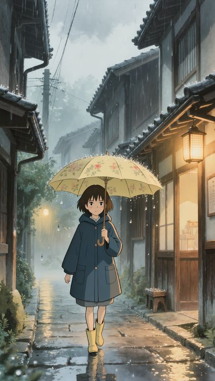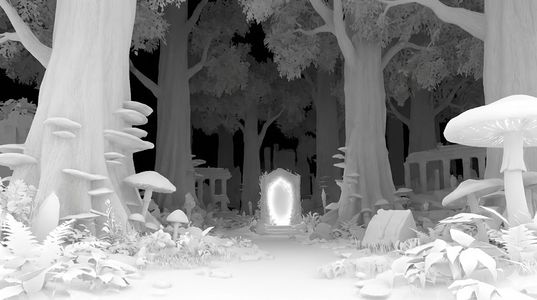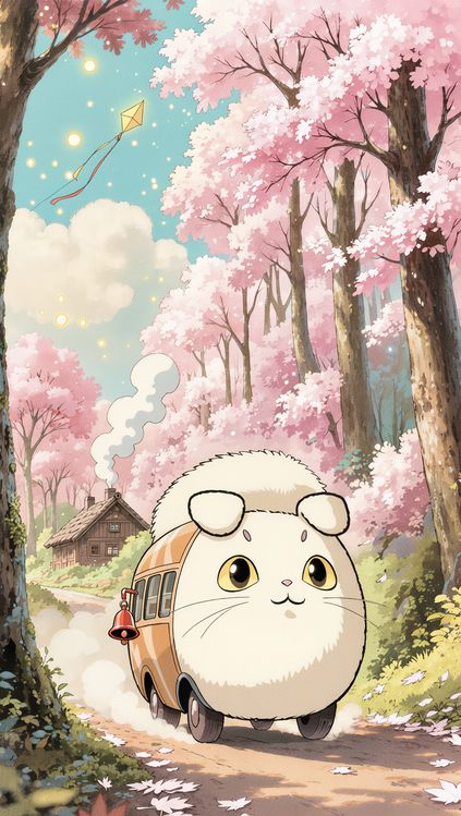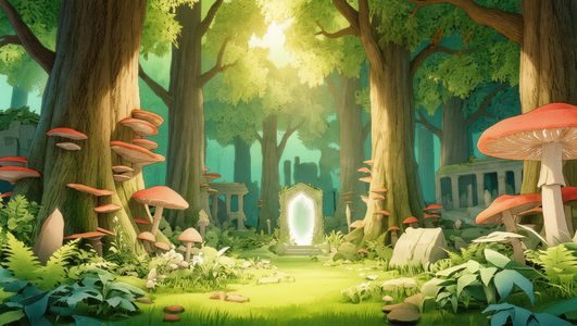 Ghibli style: Giant mushroom forest, bright portal, lush ancient trees, dappled sunlight. Hand-drawn, healing vibe, vibrant colors. |