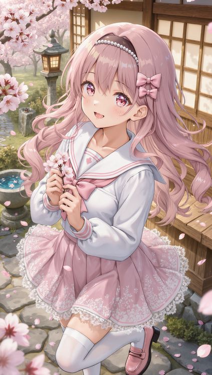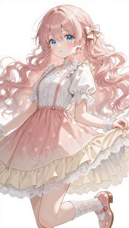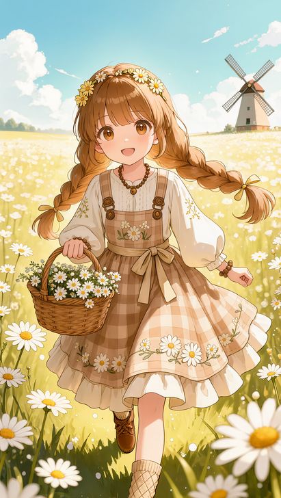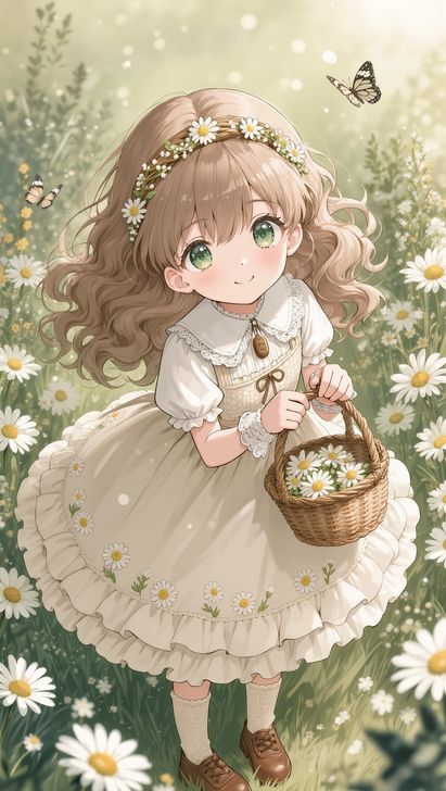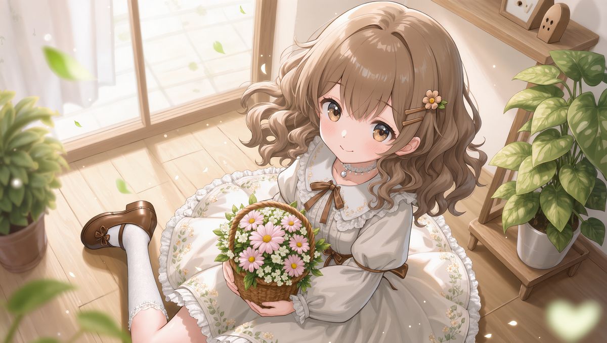 2D Anime style. 12yo girl, light brown woolly curls, wispy bangs. Sparkly almond eyes, "puppy dog" eyes, soft blush. Forest Lolita dress: white lace, vine embroidery, puffy sleeves. White lace socks, brown Mary Janes. Pearl necklace, flower clips. Holding flower basket, soft head-down smile. Clean lines, 85mm portrait, creamy bokeh. FG: blurred petals/greenery. MG: cozy room, wood decor. BG: sunny Japanese interior. Healing, "kawaii" vibe. 8K, peak detail. |