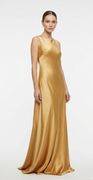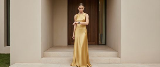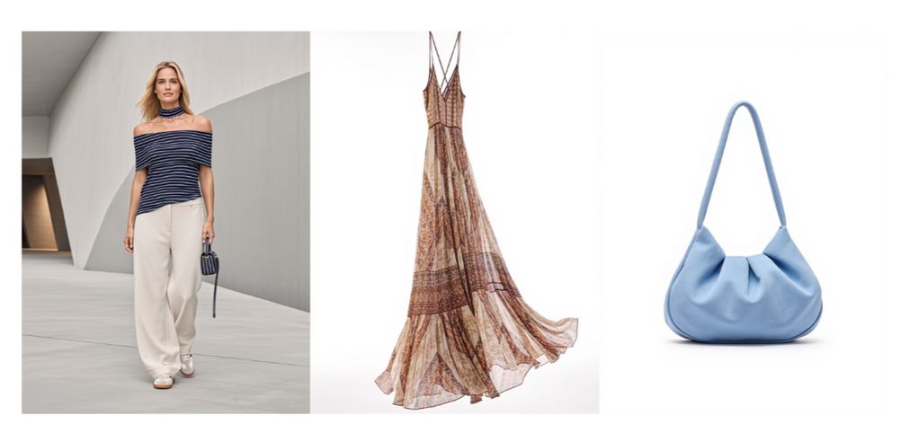 Use Image 1 as the base. Dress the person in Image 1 with the dress from Image 2 and the handbag from Image 3. |