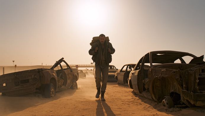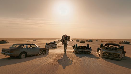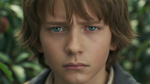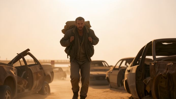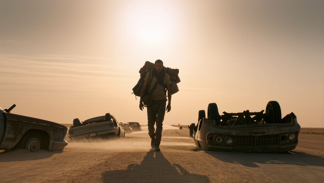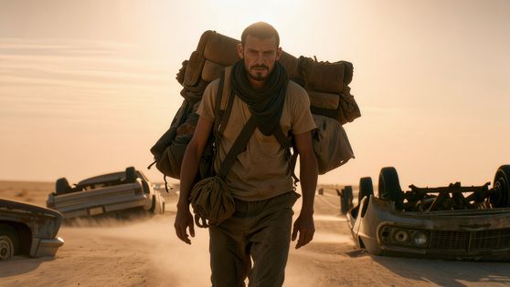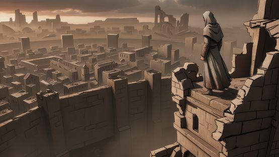 Epic wasteland fantasy movie. Cloaked boy atop ruins, bird's-eye view. Hyper-real, grit-core. |
