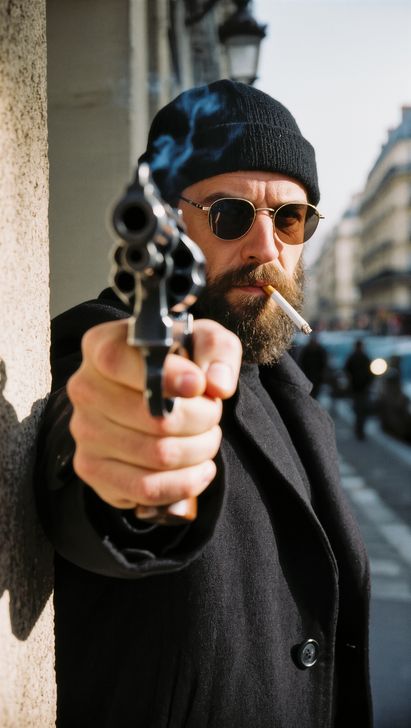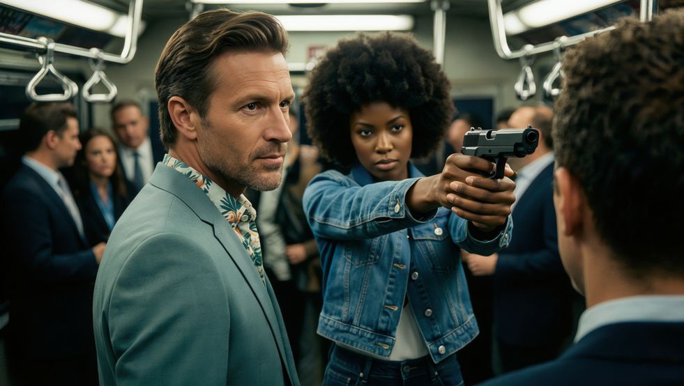 prompt: The man stands beside the woman in a close-up shot. She holds a handgun aimed at the crowd, her body slightly turned. The setting is a crowded subway car with cool white fluorescent lighting and dim shadows. The shot is over-the-shoulder, with the crowd's backs in the foreground and the woman in the background. The camera angle is eye-level, with a shallow depth of field blurring the background. The scene has a tense, cinematic feel, shot on Kodak Vision film with tones of gray and black. | |