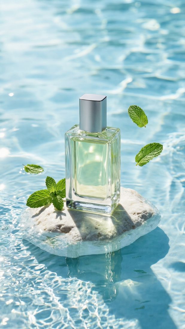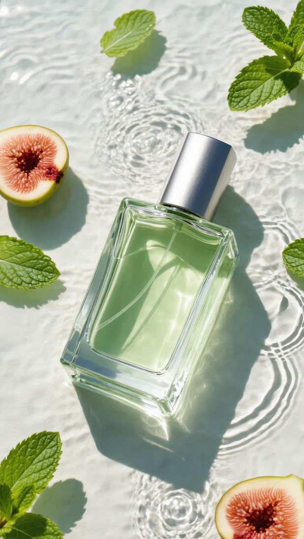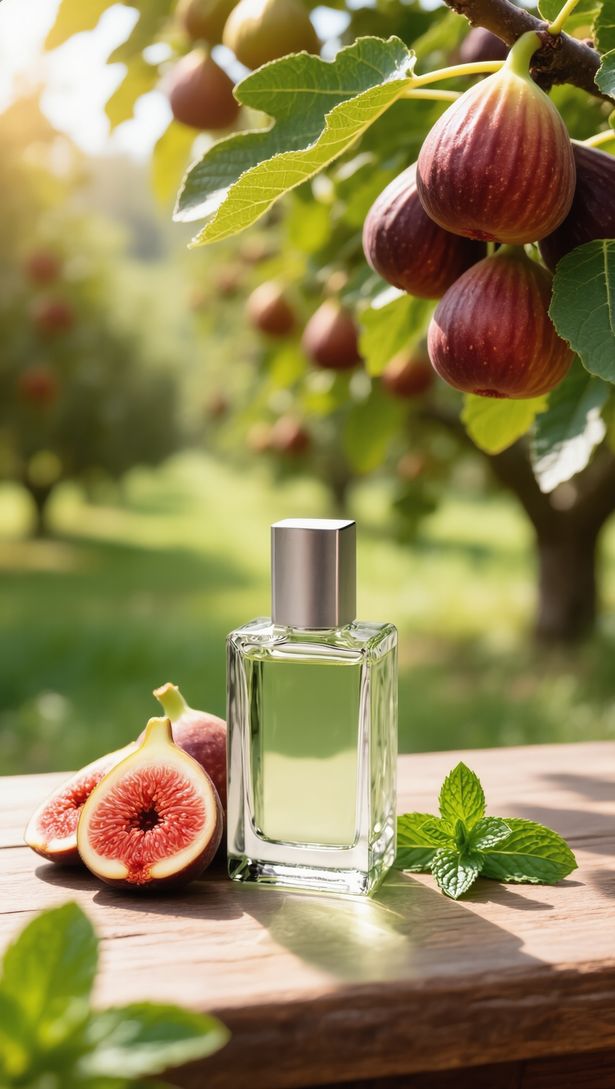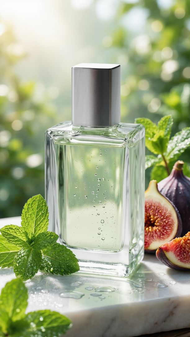 Prompt: Fig & Mint perfume. Summer fresh, organic, zero-additives. Consistent bottle shape. Ad series. Reference: | ||||