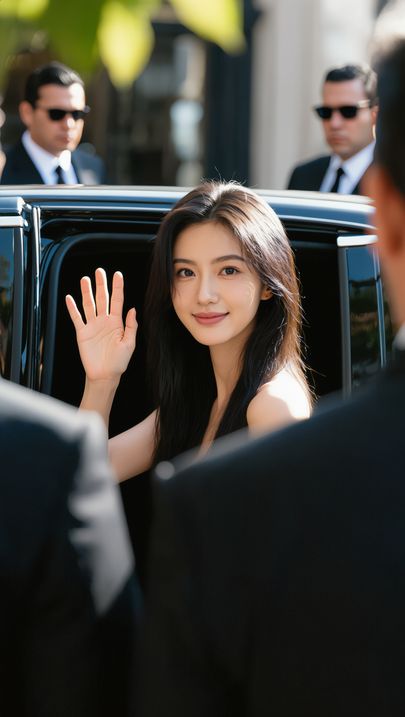 Portra 400 film, low-con soft light. Outdoor "paparazzi" candid, fan-service wave. Random/high-angle, profile or front. Foreground bokeh/obstruction. Clear face, dewy skin, wind-swept hair. Bodyguards in shades. 4K, slight shake, mid-grain. Wide shot, luxury vibe. Sun behind, rim-lit hair. |
