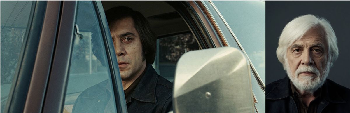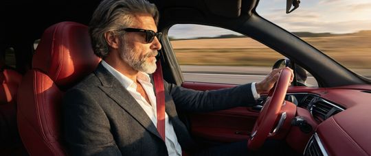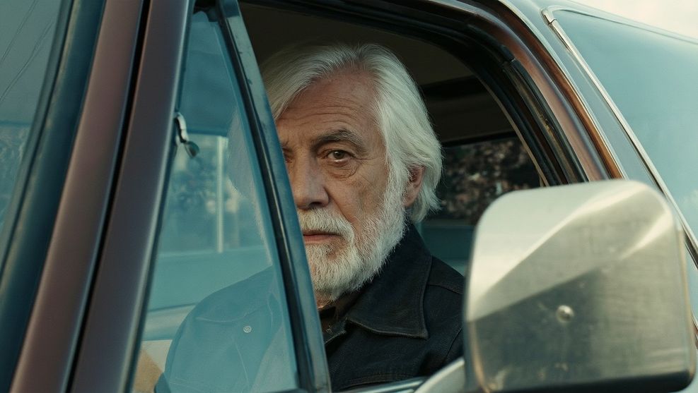 prompt: Replace the man in the car from image 1 with the elderly person from image 2, keeping the same lighting and atmosphere, and replicate the man's expression. | |
