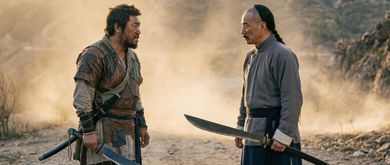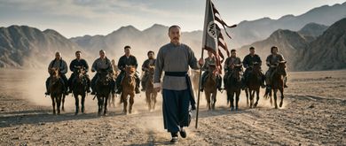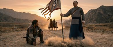 Prompt: Huang (Ref 1) vs Chen (Ref 2), Setting (Ref 3). Escort vs Bandits: Rival leaders clash, brutal melee, Escorts win. Storyboard sequence. Reference: | ||||||