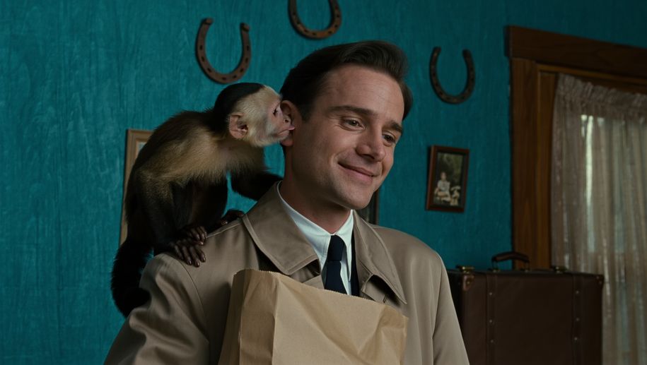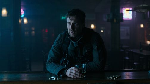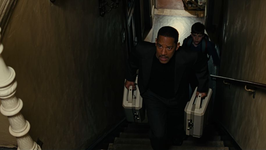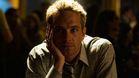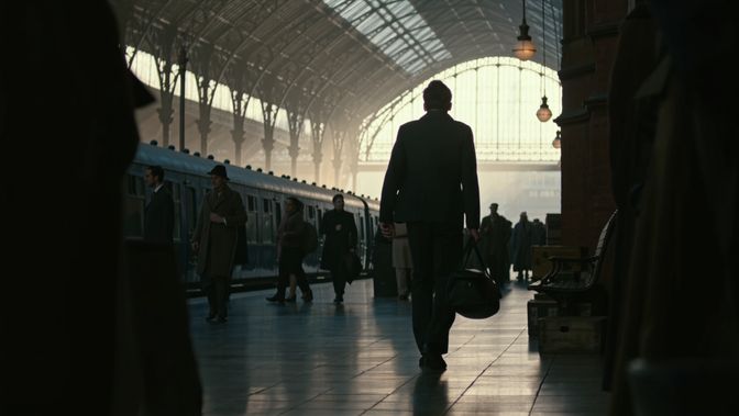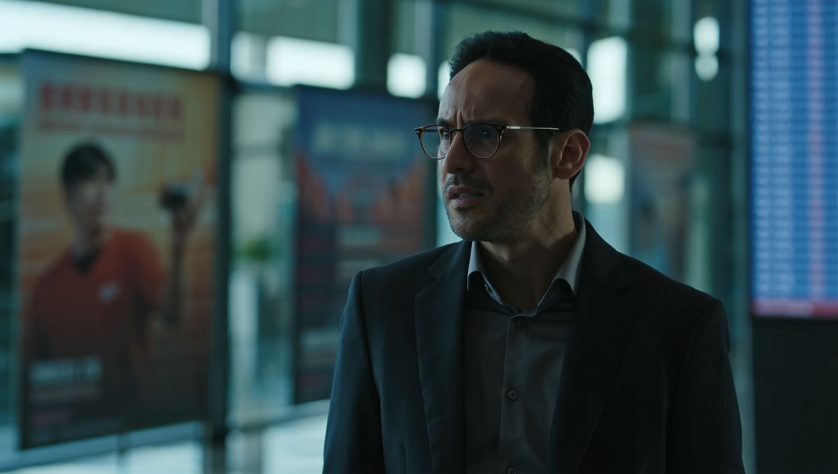 Real cinema style. Male in dark suit, grey shirt, glasses at airport. Alert side-eye. Backdrop: "Running Man" posters, flight screens. Mixed natural/cold light. MS shot, eye-level. Face-focus, bokeh. Cold tones, film grain. Suspense/tension vibe. |
