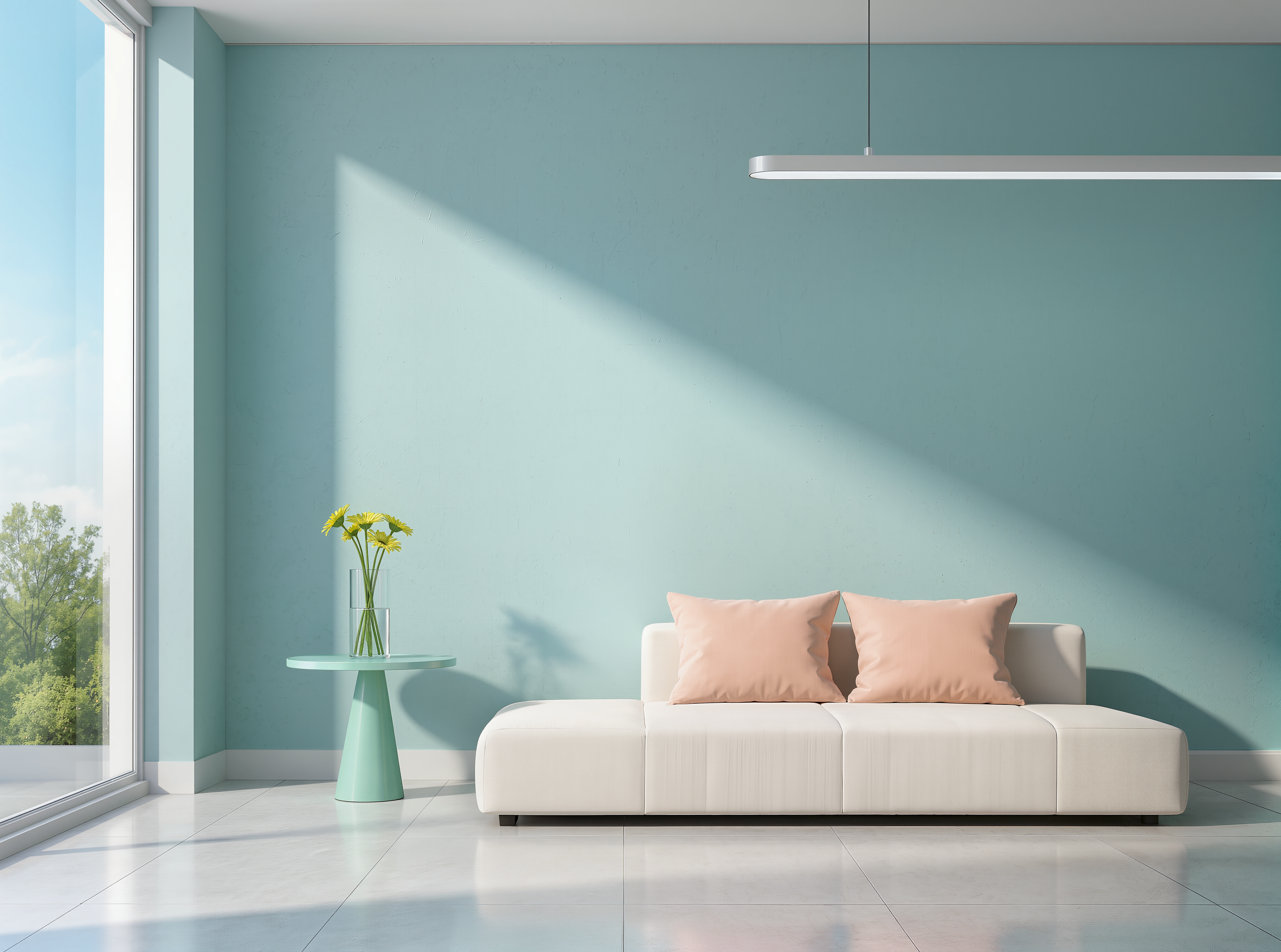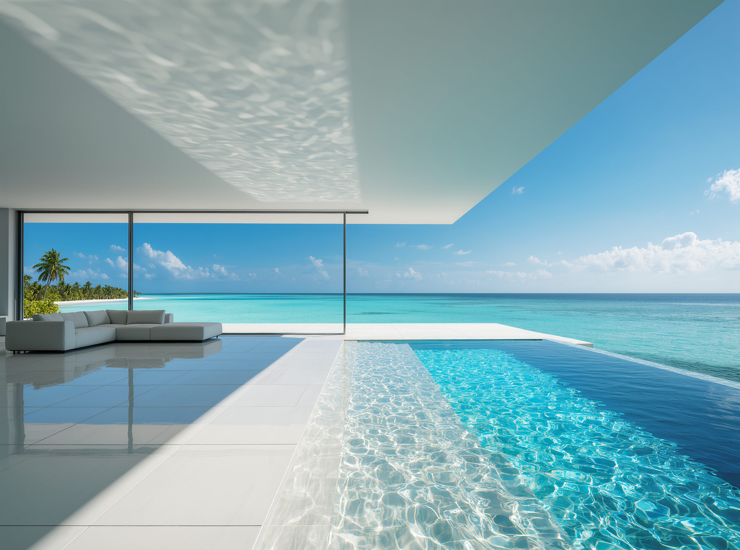 A futuristic minimalist fitting room. Seamless matte pink walls and a large curved floor mirror reflecting a cool silver-pink glow. Soft ceiling strip lights wash the space evenly. Pink velvet carpet below. No clutter, pure and clean. Luxury couture atmosphere, smooth textures, crisp high-quality image. | A minimalist modern tea room. Matte white walls under soft natural light. A vermilion ceramic teacup on the table as the focal point. Red silk cushions contrast with a white linen sofa. Clean shadows, simple composition. Eastern minimalism, premium and refined texture. | A modern minimalist bathroom. Matte pink tiles softened by warm steam, slightly hazy. A white bathtub reflecting a faint pink glow. No clutter, clean and simple. Soft diffused light and gentle reflections. Moist textures, delicate and relaxing home aesthetic. | Blue-green/Teal palette. A quiet seaside retreat space. Teal stone flooring and deep blue walls under soft light. Outside the window, a deep blue-green ocean. Minimal and uncluttered. Light and shadow define depth and stillness. Calm, detached, upscale resort atmosphere with clear, airy visuals. | Vintage reddish brown palette. A sunlit wooden craft workshop in the afternoon. A dark solid-wood workbench covered with leather pieces and tools. Warm natural light reveals fine wood grain textures. Rich, heavy tones. A handcrafted, traditional, nostalgic atmosphere with strong storytelling. | A sunlit minimalist living room. Light sky-blue walls and soft peach cushions. Sunlight diffuses evenly across the room, bright and airy. Clean, harmonious colors. Calm, comforting, modern home atmosphere. | A crystal-clear beachfront villa living room. Large floor-to-ceiling windows face an infinity pool. Blue light reflects and refracts into the interior, casting ripples across white tiles. Cool, fresh air and ultra-clean tones. Luxury, relaxed resort atmosphere. Realistic image with smooth, detailed blue gradients. |