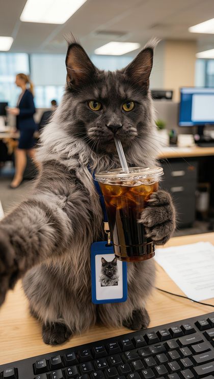 POV selfie. Chill, tired, slightly annoyed face. Sipping black iced coffee from a clear to-go cup, ice visible, straw in mouth. Wearing a lanyard badge with its own face photo. Desk setup with keyboard. Office background, coworkers walking around. Real-life candid photo vibes. Natural light. No text. |