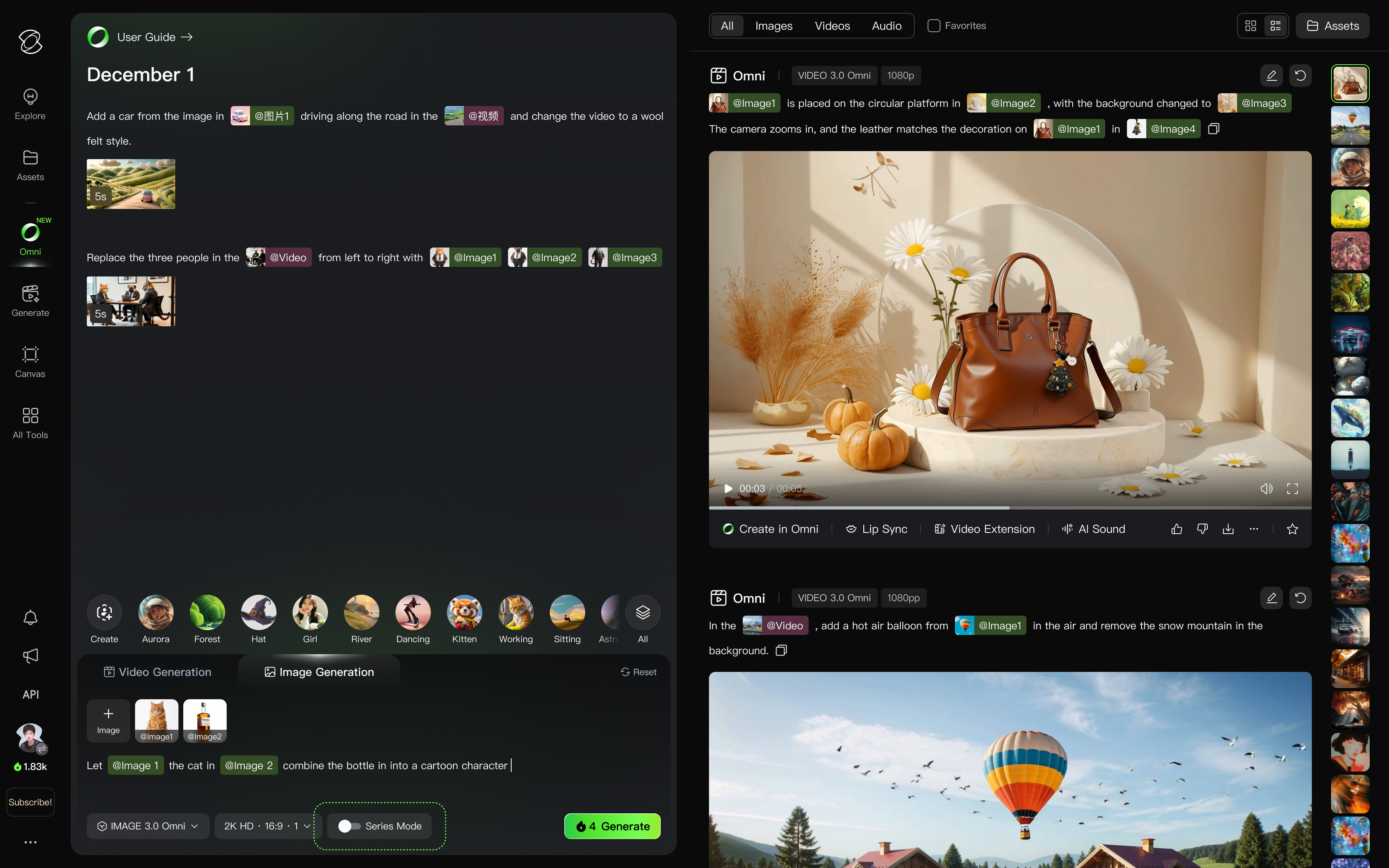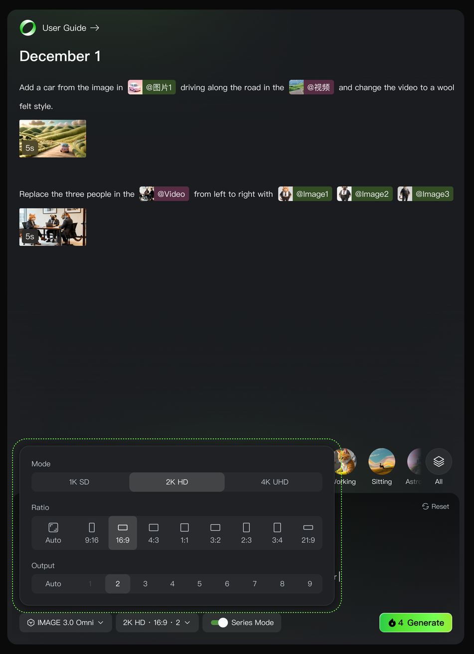 1. Switch to "Image Generation" mode to experience the new 3.0 Omni model features; 2. New "Image Series Mode" feature: a. Applicable scenarios: Batch operations on images/coherent narrative scenes (e.g., batch image ratio adjustments, multi-shot output at once), Text-to-Image Series, Image-to-Image Series, and Multi-Image-to-Image Series, etc. b. How to use: Select to enable the image Series Model, click again to disable it. c. Number of images-Smart Mode: In "Image Series Mode," a new "Auto" option is added to the number of images. When selected, the model will recommend the appropriate number of images for content continuity. If the number of images is fixed, select the specific limit. The minimum number of images in this mode is 2. 3. New "4K" high-definition option: a. Applicable scenarios: For output images requiring higher resolution. b. How to use: Select the "4K" option before generating the image. |