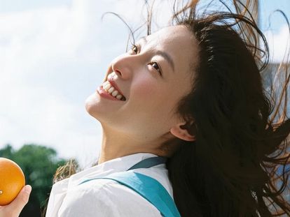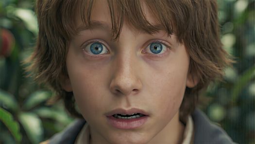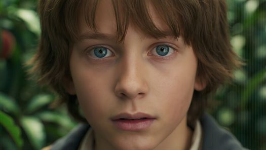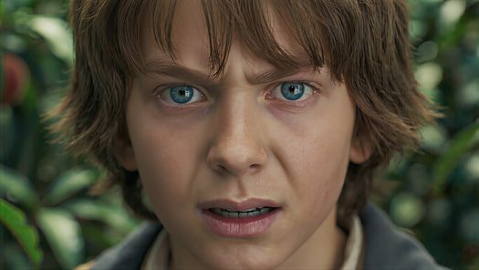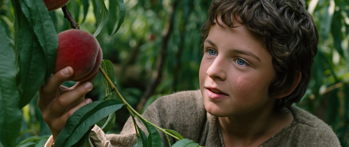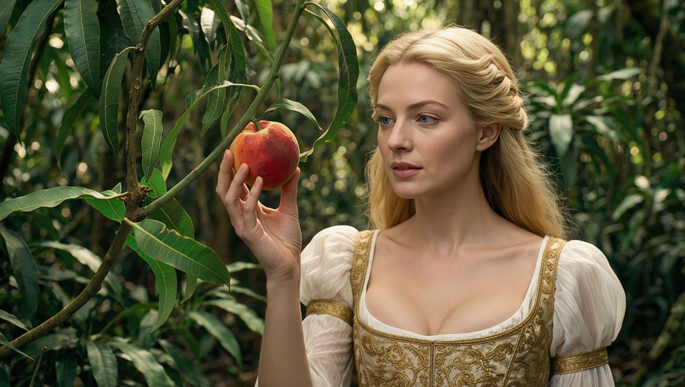 prompt: Create a fantasy movie still based on the goddess’s look in the reference image, replicating the texture and tone of image 2. In a magical jungle, the goddess reaches for a ripe red peach, her expression focused and curious. The shot is a bird’s-eye view with a dense peach orchard, framed by branches and leaves. Soft, diffused light creates dappled shadows, with the focus on the peach and her hand, and a blurred background for a cinematic, grainy feel. | |