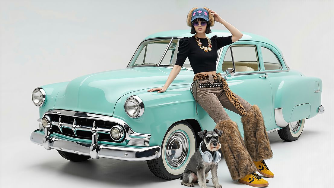 With the car from image 1 as the environmental subject, the character from image 2 is wearing the top from image 4 and the pants from image 5, with shoes from image 7 and a hat from image 8, and glasses from image 9. The character is sitting on the hood of the car from image 1, while the dog from image 3 stands at the character's feet. Generate a fashion photography shot with high-end, fashionable lighting, ensuring the image is clear and realistic. |
