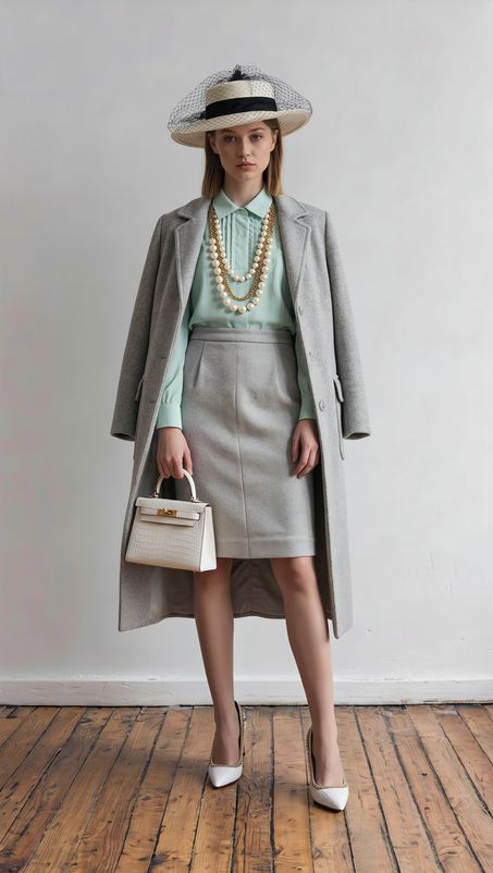 Use Image 1 as the base. Dress the person in Image 1 with the shirt from Image 3, the outerwear from Image 2, the skirt from Image 4, the shoes from Image 6, the hat from Image 5, and the handbag from Image 7. |