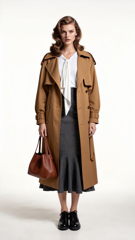 Use Image 1 as the base. Dress the person in Image 1 with the shirt from Image 2, the outerwear from Image 3, the skirt from Image 4, the shoes from Image 5, and the handbag from Image 6. |